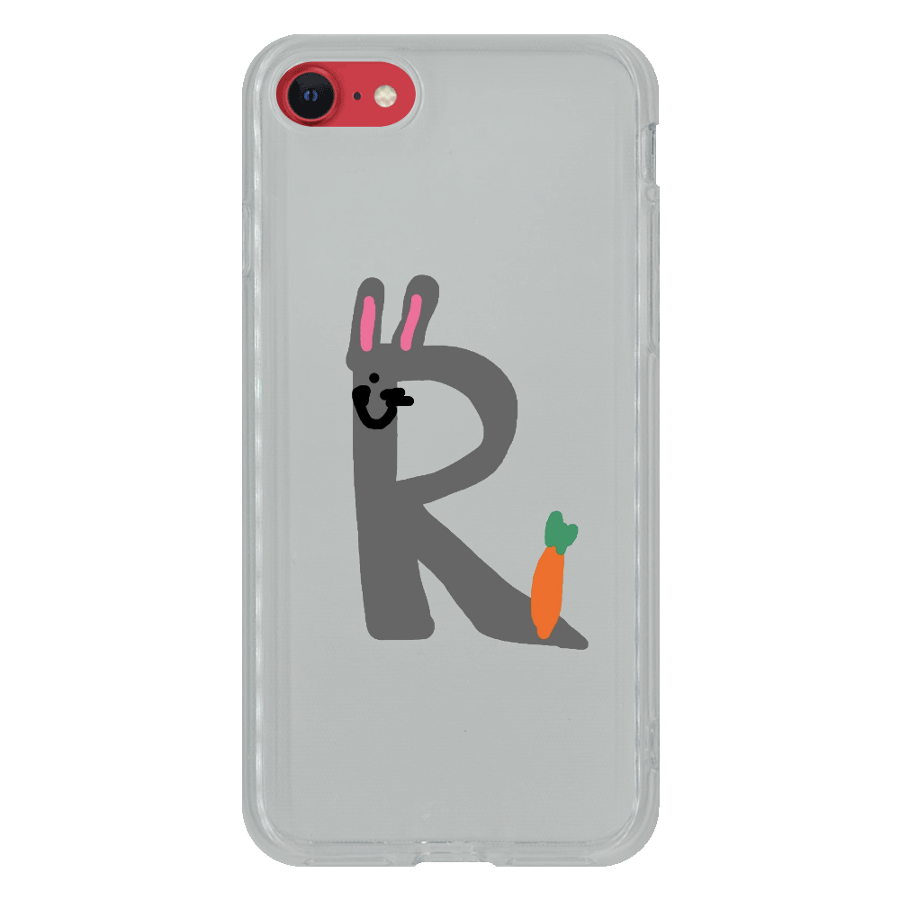 アルファベットのRをあしらったスマホケースです。Rはウサギで、にんじんを持っています。